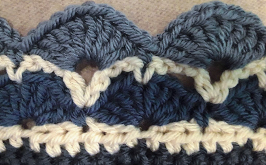 For my striped afghan, I use a fuller fan. I also decided I want a rounded shell-like look, rather than the more angular look of the typical fantail. So I use double crochet V’s (rather than half double crochet.) And now, finally, after all this farting around, here are the instructions!