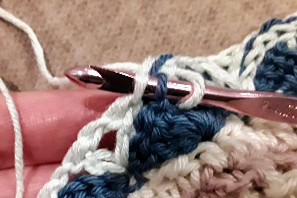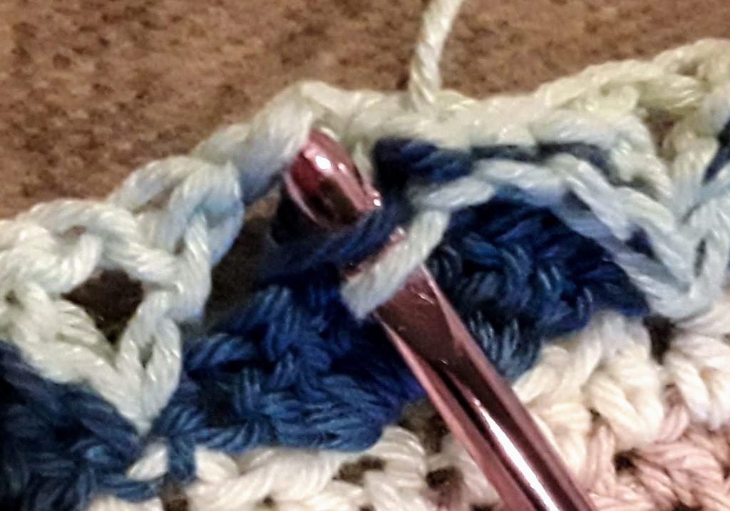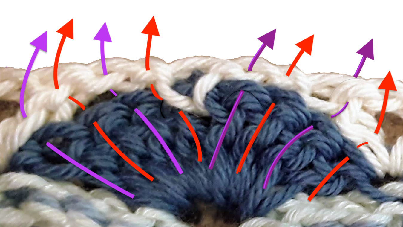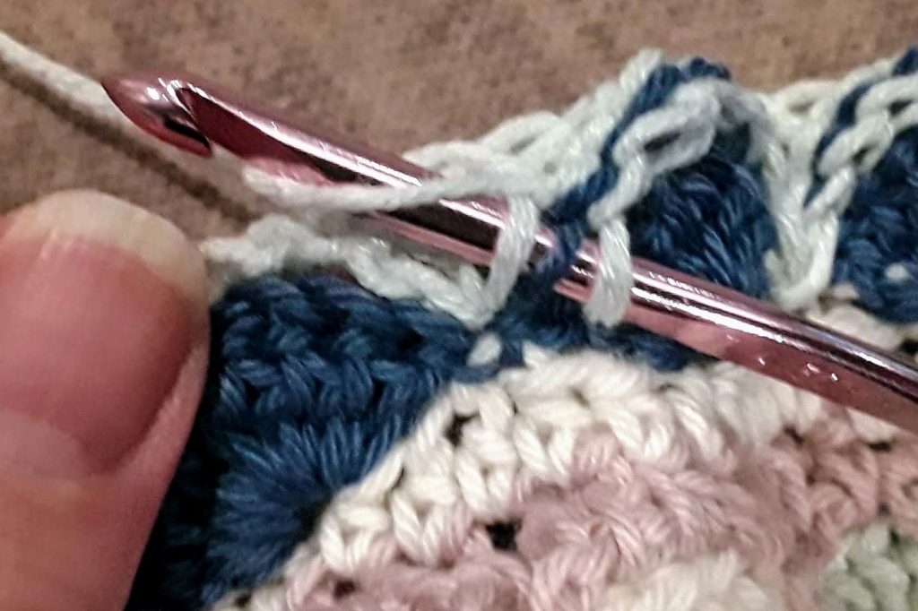 Work on Wrong Side. For FAN dcs, you’ll insert your hook through Front Loops Only (aka FLO.) The “Front loop” is the loop nearest you. When inserting your hook into chain stitches, use the back bump. Here are the steps for a full fan (most of what you’ll do.)