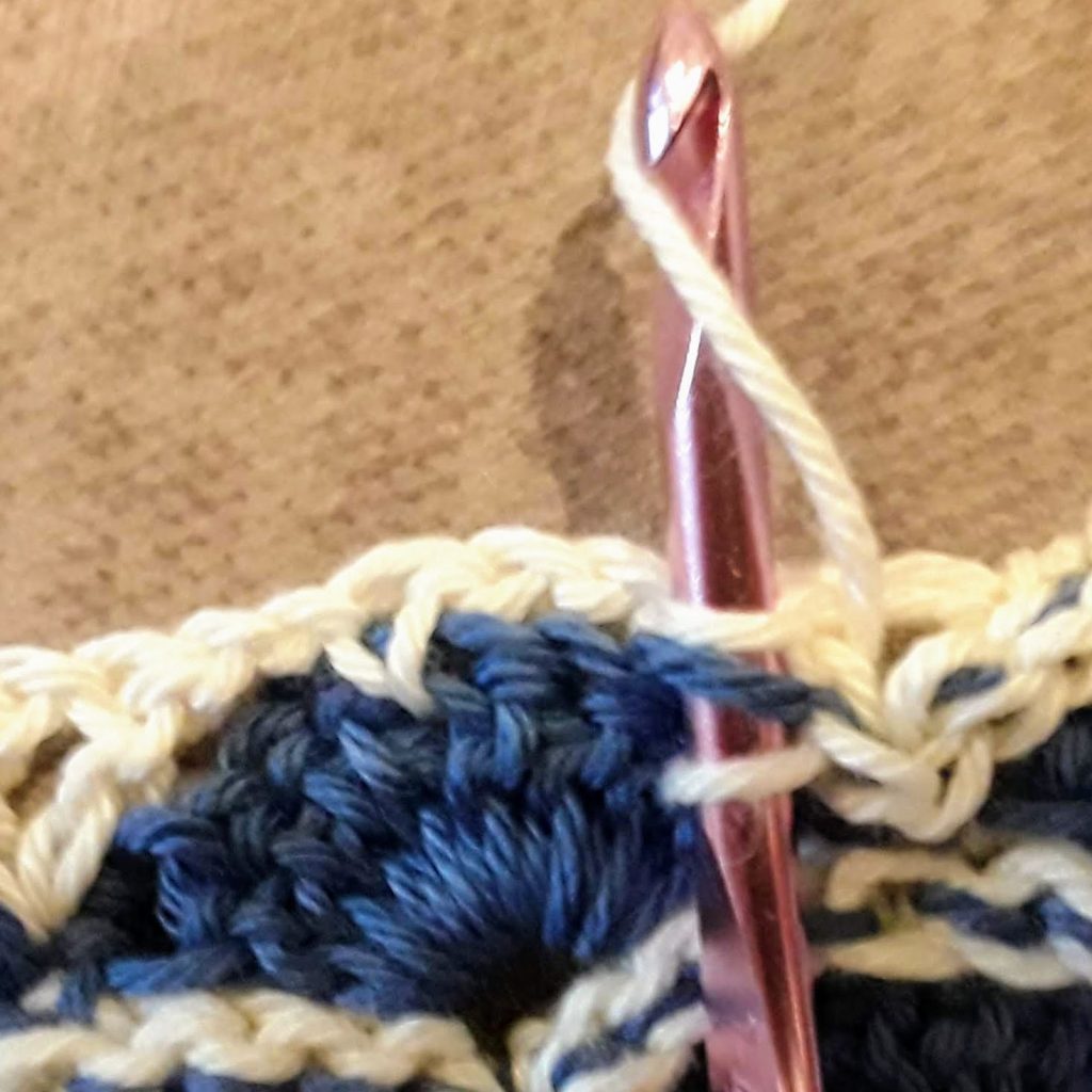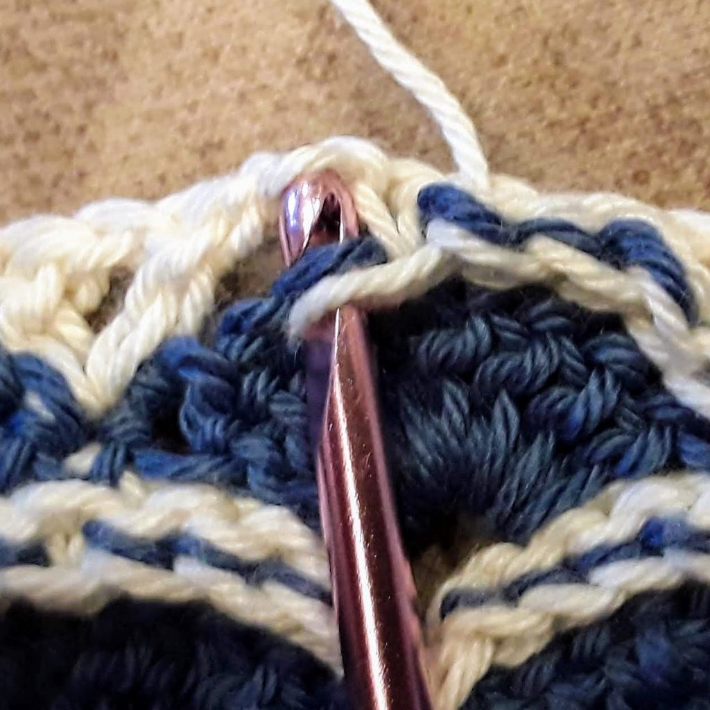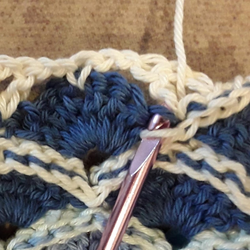I’ve been working through the chain stitch nearest the sc, skipping the other chain stitch, and working 2 slip stitches through the nearest dc of a V. So for the beginning of the row: