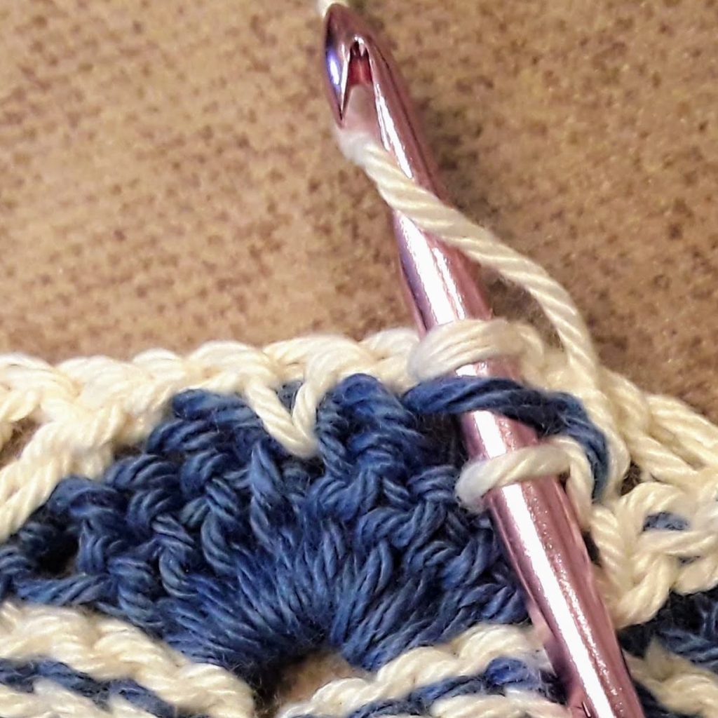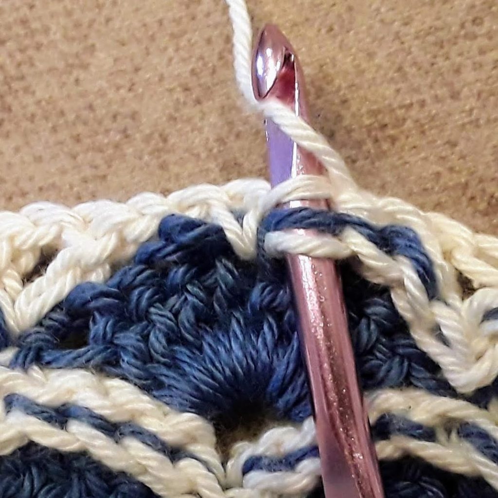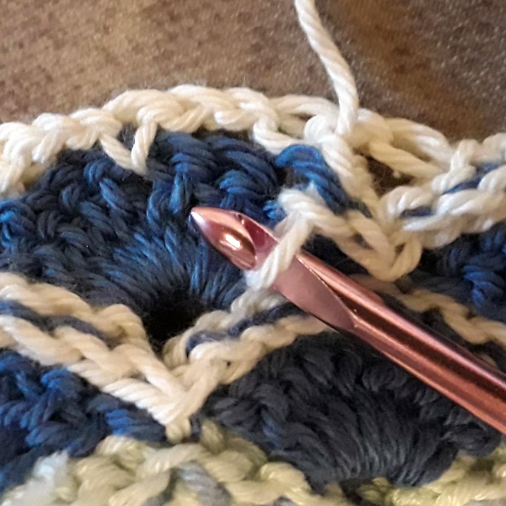 I’ve been working through the chain stitch nearest the sc, skipping the other chain stitch, and working 2 slip stitches through the nearest dc of a V. So for the beginning of the row: