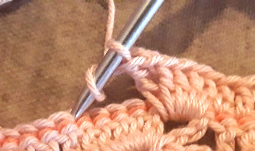 - Turn the work; sl st in each st across. See pictures for row 4 to see how to insert the hook.