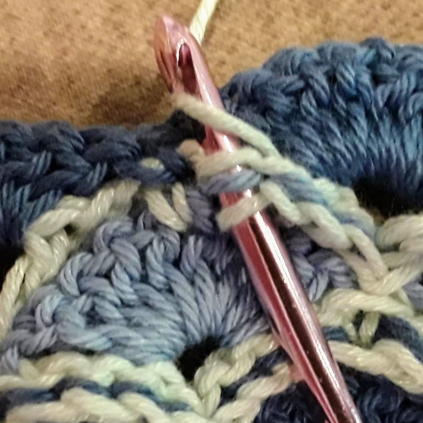 The basic idea is to add slip stitches connecting every stitch of the Fan to the V row above it. We can do this at any point (I did it after making the majority of the “waves” stripes, since I didn’t see an issue right away), but it is a little easier and looks better if you do it right away after each V row.