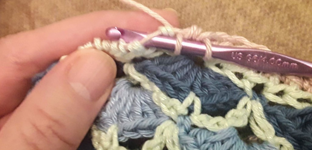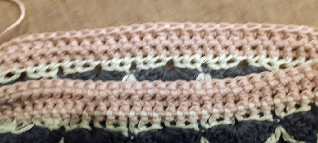 I like the purplish color near the top. Especially since I’m making it for someone whose favorite color is purple. But it really doesn’t go with the dozen rows of the peach color at the bottom. (That’s a bit hard to tell from photos, but believe me, it doesn’t go.)