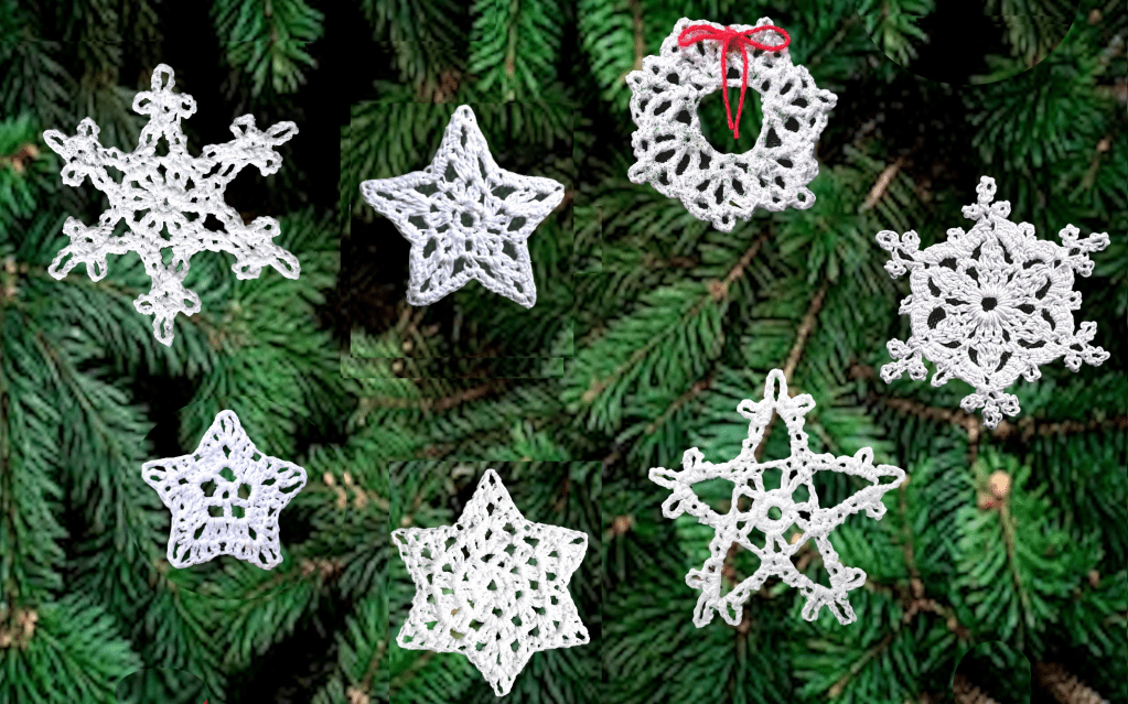 Now that’s done, there are this year’s holiday projects for me. The fancy afghan for daughter #1 (no photo, since the actual design is supposed to be a surprise.) A scarf for daughter #2. (Seem unfair? Don’t worry. Daughter #2 already has a fancy afghan. Guess who made it?) For the single step-daughter, (guess what! How did you know?) Tiny stars and snowflakes for her first tree.